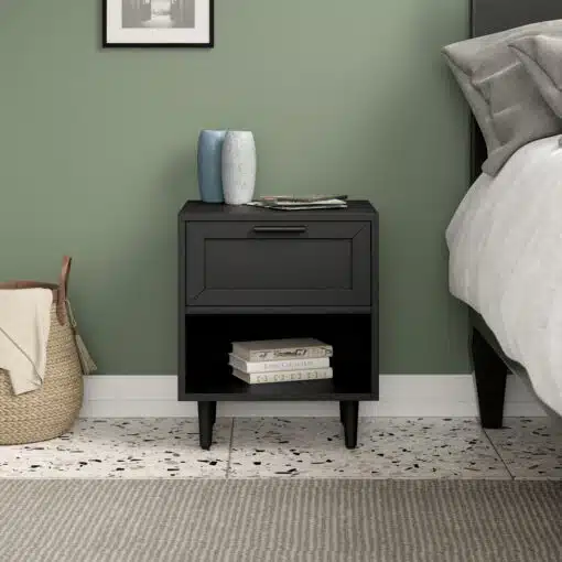 שידת צד לחדר השינה עשויה מעץ מתועש עם חיפוי מלמין יצוק . לשידה מגירה לאחסון רב תכליתי נעה על מסילה טלסקופית, רגלי השידה חזקות ויציבות עשויות עץ.