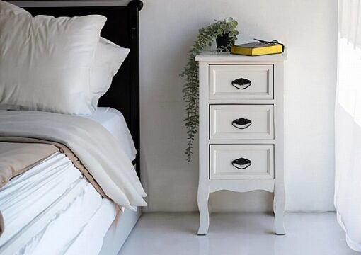 שידת לילה מעוצבת בצבע לבן עם שלוש מגירות אחסון , עשויה מעץ מלא משולב עם אם די אף. השידה מעוצבת בסגנון פרובנס.