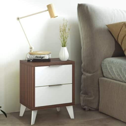 שידת לילה מעוצבת ומודרנית, בעלת שתי מגירות לאחסון. השידה עשויה מעץ מתועש עם חיפוי פורמייקה איכותית, בגוון לבן עם מגירות בגוון עץ אלון.