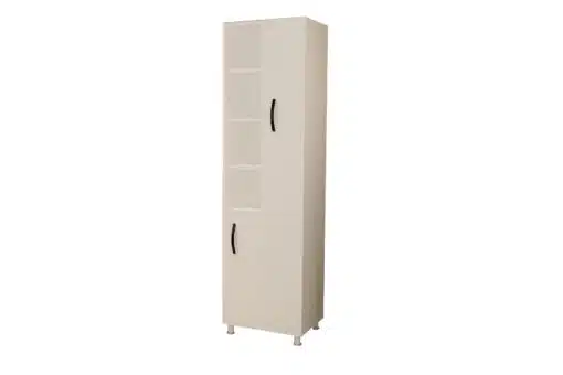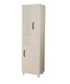 ארון דלת אחת לבן מחולק לארונית סגורה עם מדפים ומדפים פתוחים לאחסון. הארון עשוי מעץ מתועש עם חיפוי מלמין יצוק. הארון מתאים למטבח לחדר השירות או לחדר הכביסה.