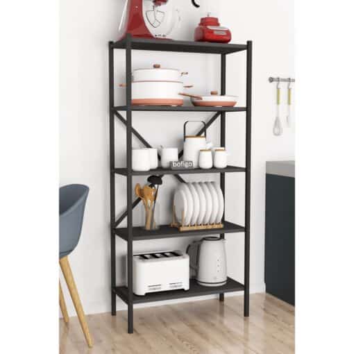 ארון מדפים פתוח בעל 5 מדפים גדולים ונוחים לאחסון, עשוי מעץ מתועש עם חיפוי מלמין יצוק ומסגרת מתכת אל חלד חזקה ויציבה בצבע אפור כהה. הארון בעל עיצוב אלגנטי ומודרני, והוא מתאים למגוון שימושים, כגון: