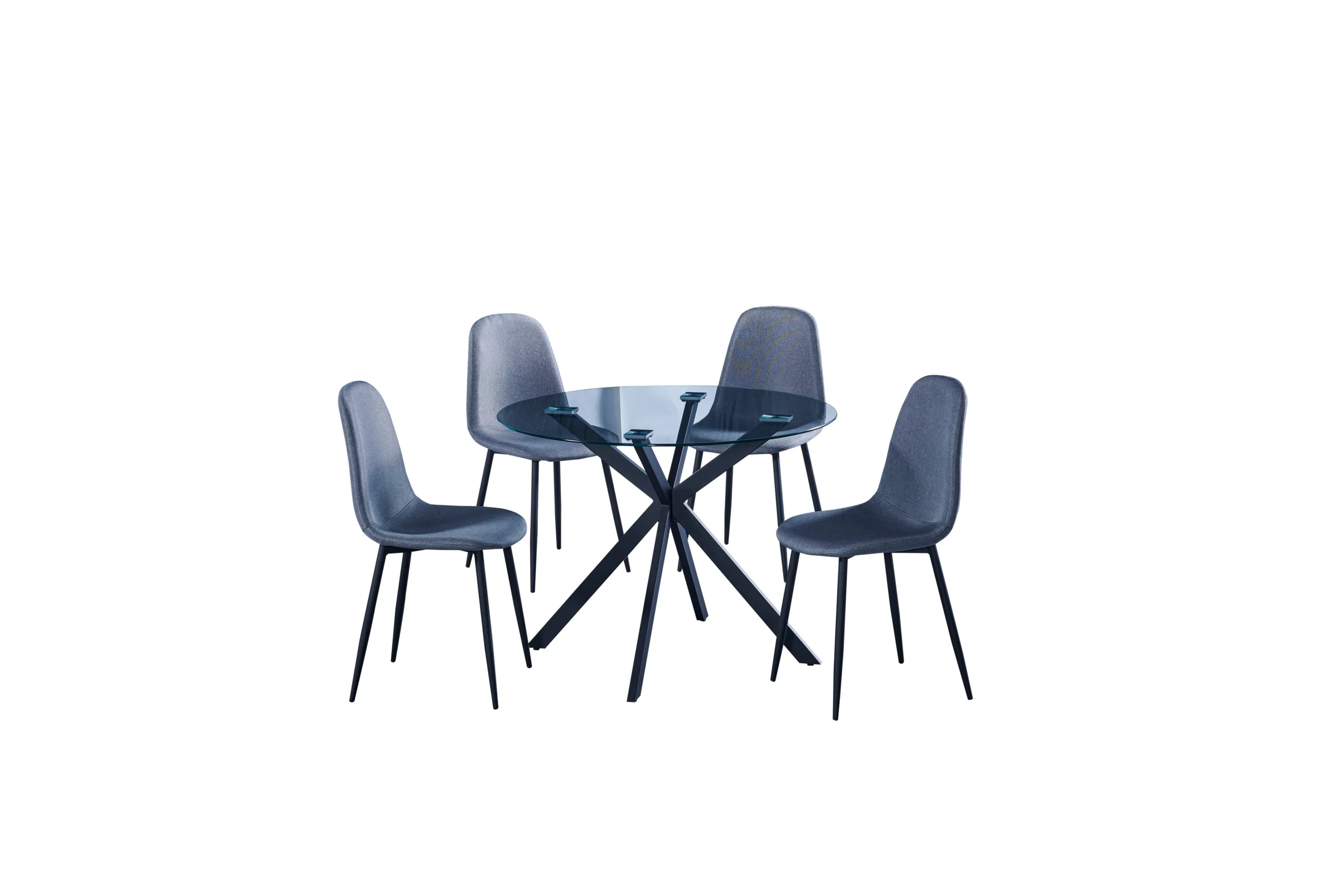 העיצוב המודרני והנקי של פינת האוכל משלב קווים פשוטים וצורה עגולה שמשדרת אלגנטיות עדכנית. משטח השולחן עשוי זכוכית מחוסמת איכותית בעובי 8 מ״מ בגוון אפרפר שקוף שיוצר תחושת מרחב וקלילות, והרגליים עשויות מתכת אל-חלד בצבע שחור עם עיצוב גיאומטרי מרשים שמשתלב בהרמוניה עם משטח הזכוכית. השילוב בין החומרים המודרניים והצבעים הנקיים יוצר מראה מאוזן ומושך עין שמתאים לכל סגנון עיצוב עכשווי.