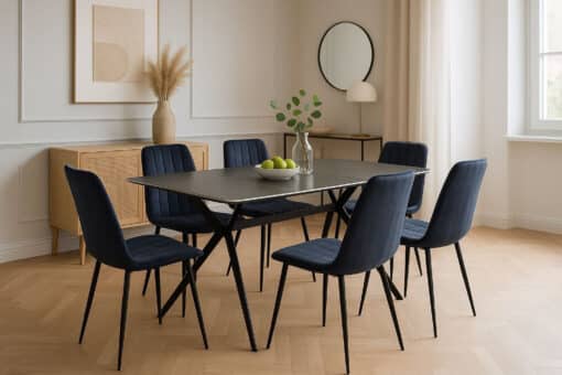 תקציר מוצר – פינת אוכל מודרנית עם שולחן קרמיקה ו-6 כיסאות מרופדים