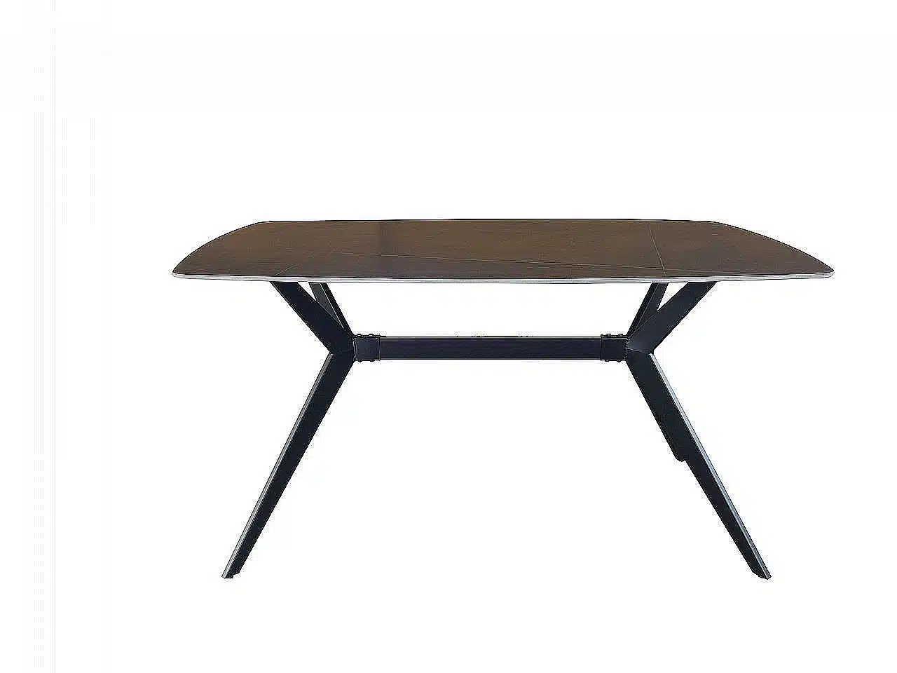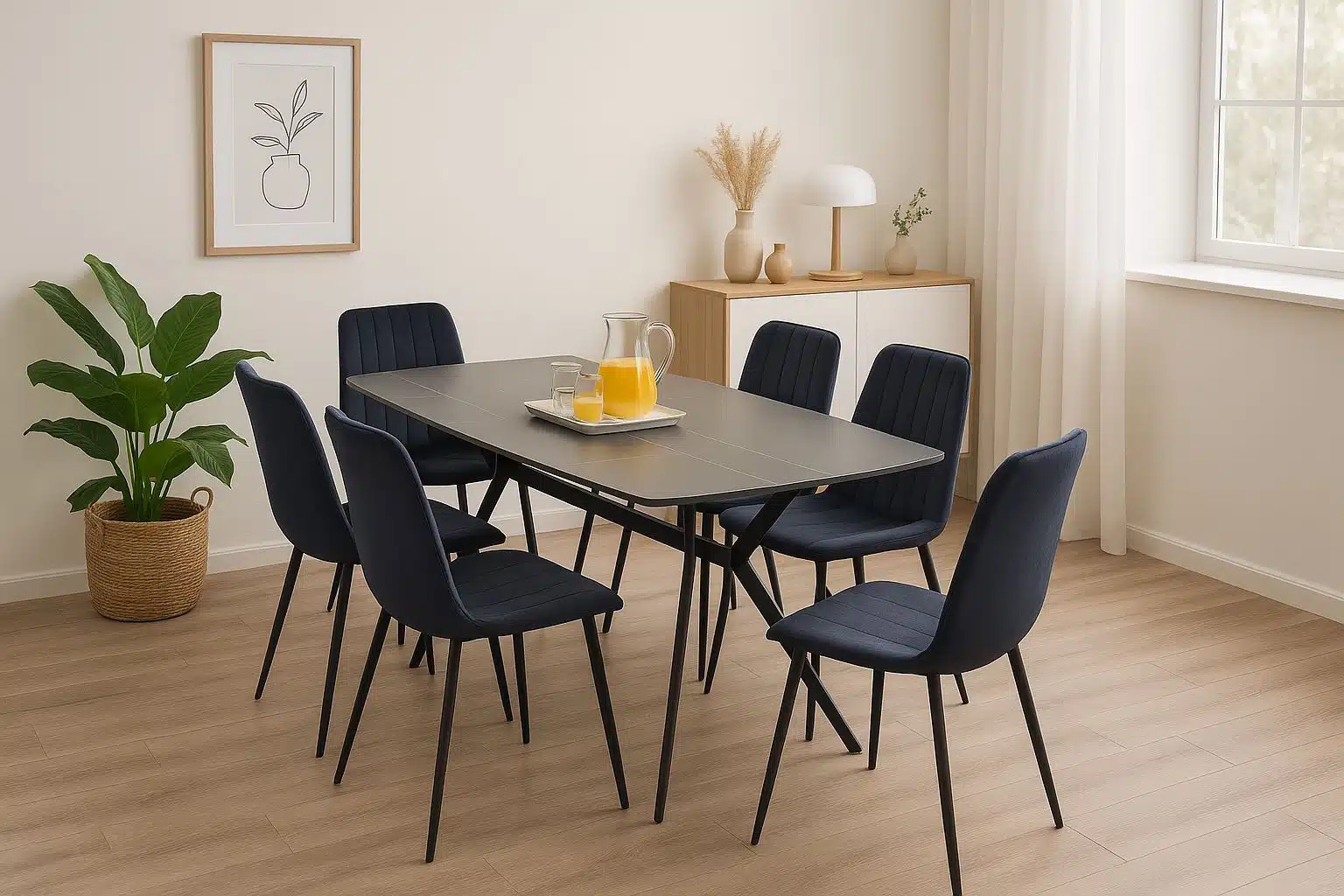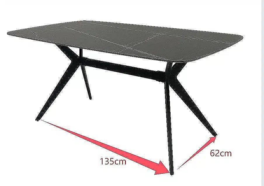 העיצוב המודרני והנקי של פינת האוכל משלב שולחן מלבני עם פלטת קרמיקה דקה בגימור אבן טבעית יחד עם רגלי מתכת שחורות, ליצירת מראה אלגנטי ומרשים המשתלב בקלות בכל סגנון עיצובי.