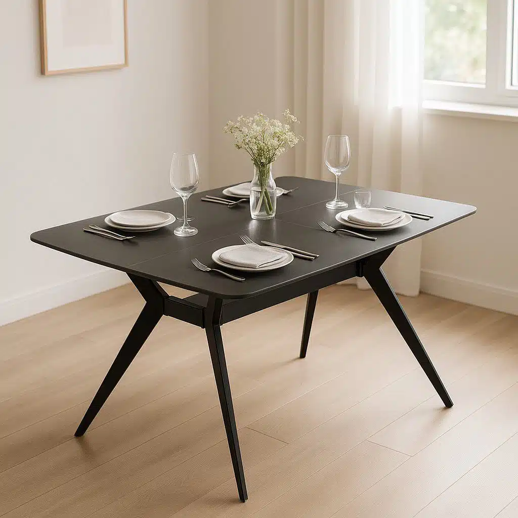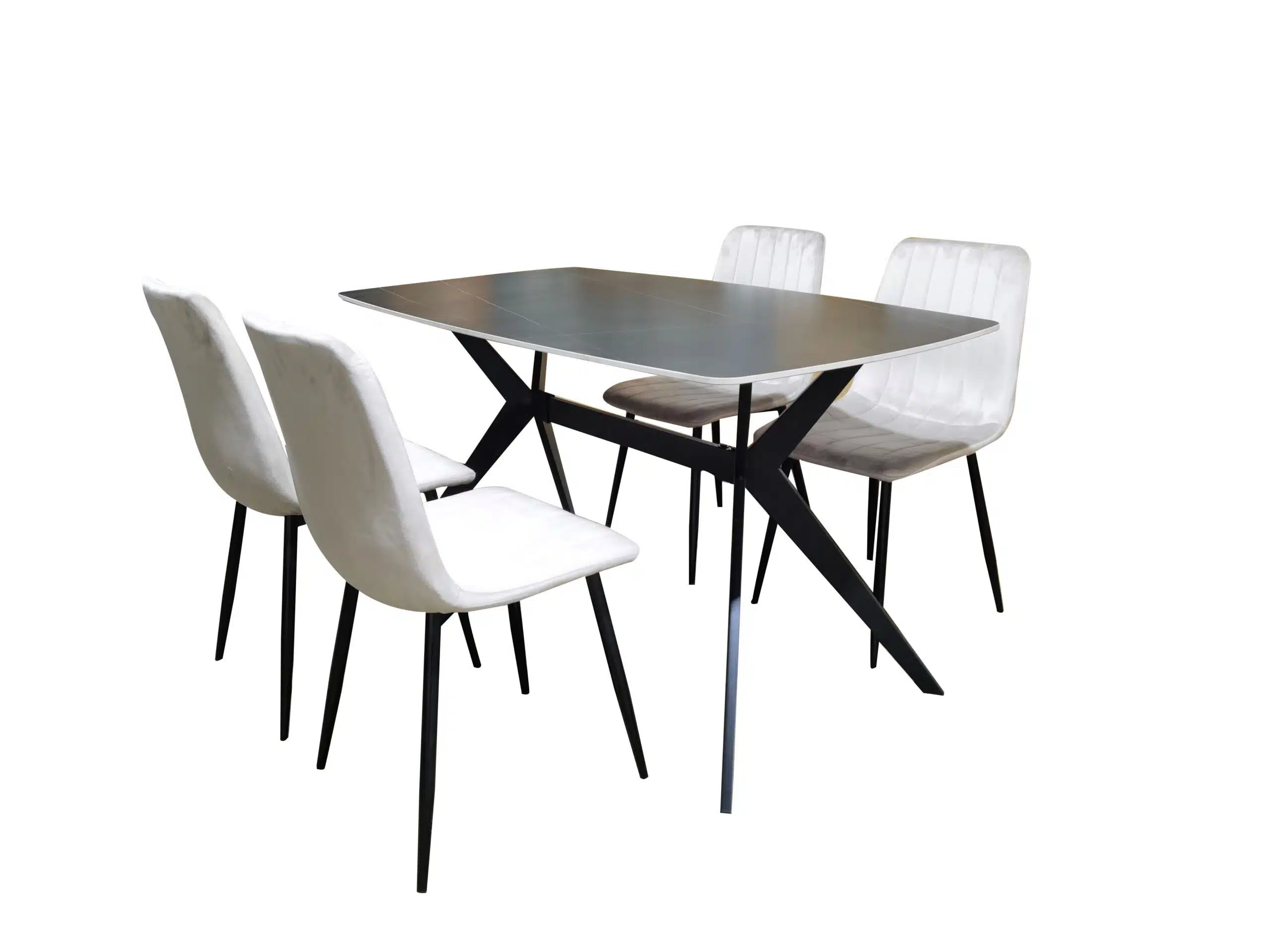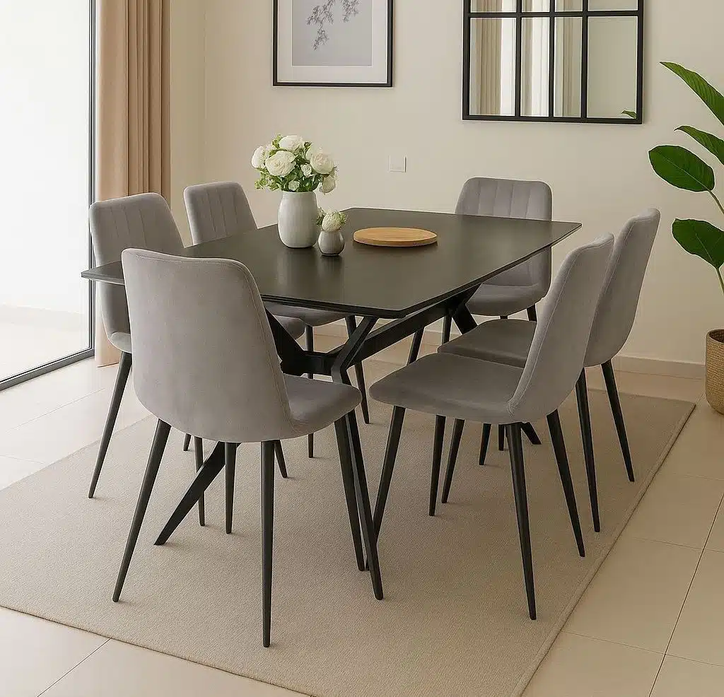 העיצוב המודרני והנקי של פינת האוכל המודרנית כולל שולחן מלבני עם פלטת קרמיקה דקה בגימור אבן טבעית ורגלי מתכת שחורות, המעניקות מראה יוקרתי לצד יציבות גבוהה. השילוב בין הקווים הנקיים לחומרים האיכותיים יוצר מראה מרשים שמתאים לכל סגנון עיצוב.