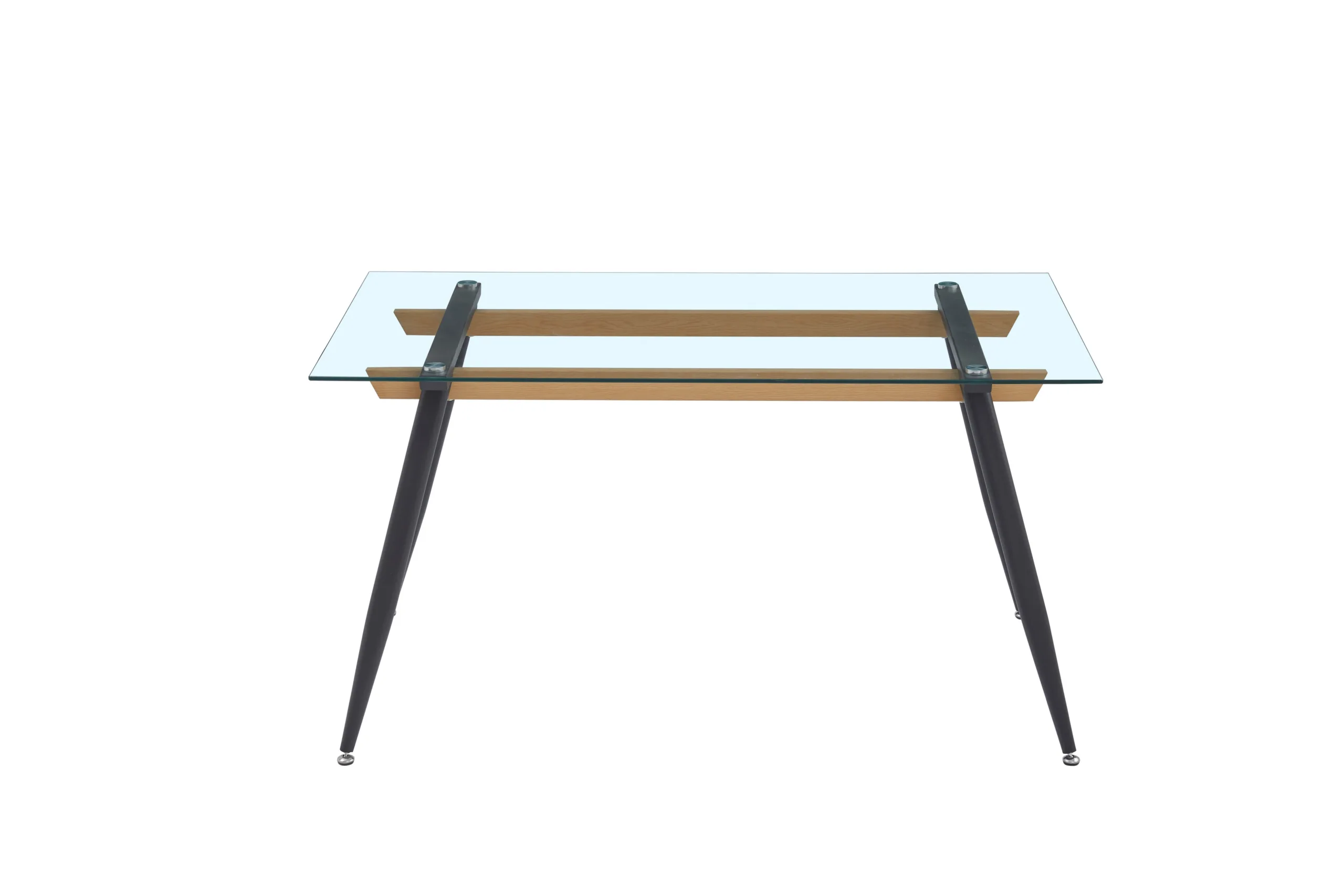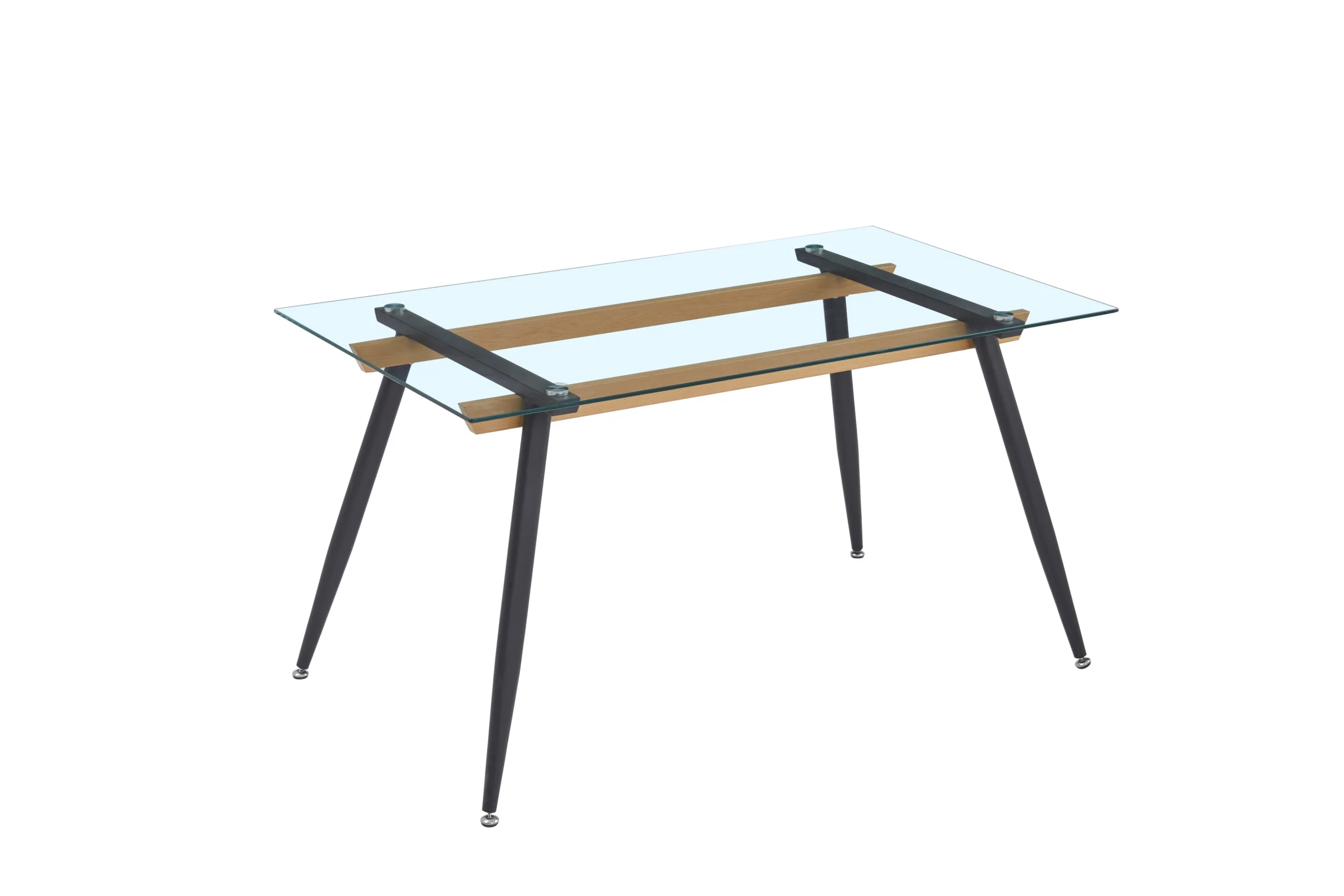 העיצוב המודרני והנקי של שולחן אוכל זכוכית מודרני מתבטא במשטח הזכוכית השקופה המחוסמת בעובי 8 מ"מ, המעניק תחושה של מרחב ואווריריות. רגלי המתכת מאל-חלד בצבע שחור מעניקות יציבות מרבית ומראה עכשווי, בעוד מוטות החיבור בגימור מרקם עץ מוסיפים חמימות ואופי ייחודי. השילוב בין השקיפות הקרירה של הזכוכית לבין החוזק של המתכת יוצר הרמוניה עיצובית מושלמת.