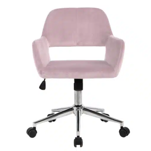 כסא מחשב בצבע ורוד מעוצב ומרופד היטב בבד קטיפה איכותי , ספוג בצפיפות גובה ומסגרת עשויה ממתכת אל חלד חזקה ויציבה בגוון ניקל . מושב הכיסא עולה ויורד וכן בולמת זעזועים באמצעות בוכנה פנאומטית איכותית.