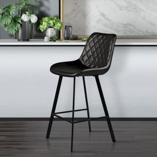 כסאות בר שחורים דמוי עור איכותיים ומעוצבים להפליא . הכיסאות מרופדים בדמוי עור איכותי ועמיד עם תפירה מעוצבת במשענת הגב , מסגרת הכיסאות עשויה ממתכת אל חלד איכותית ועמדיה , כסאות הבר האלו נוחים במיוחד ומעוצבים בסגנון רטרו קלאסי וישתלבו גם מגוון רחב של סגנונות וצבעים.