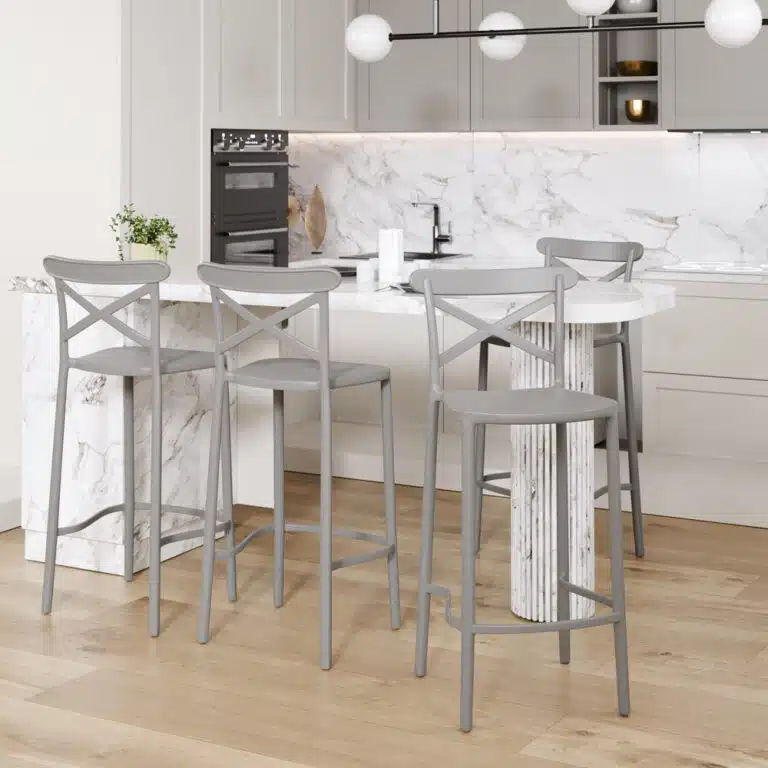 העיצוב המודרני והנקי של כיסאות הבר מתבסס על שלד פלסטיק יצוק שלם המעניק יציבות בסיסית מרשימה. גב הכיסא המאופיין בעיצוב צלב X קלאסי מוסיף נגיעה רטרו-מינימליסטית המשתלבת בהרמוניה עם סגנונות עיצוב מגוונים – מסקנדינבי ועד תעשייתי. המושב הרחב בעל קצוות מעוגלות מתכתב עם קווי הגב ויוצר מכלול ויזואלי אחיד ומרשים.
