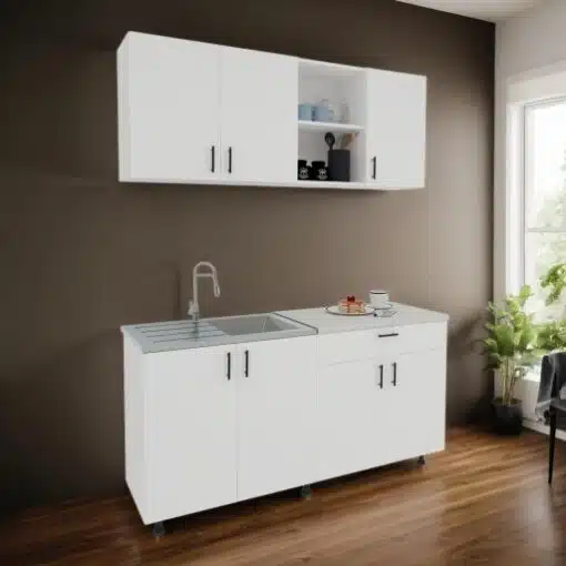 שדרגו את המטבח שלכם עם מטבח לבן מודרני ומעוצב, המושלם לחללים קטנים. המטבח כולל ארונות עליונים ותחתונים מרווחים, כיור נירוסטה ומשטח עבודה פרקטי.