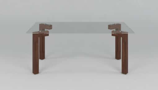שולחן סלון זכוכית מלבני בעיצוב מודרני מרהיב . מסגרת ורגלי השולחן עשויות מתכת אל חלד בגוון עץ, פלטת השולחן עשוי מזכוכית מחוסמת .