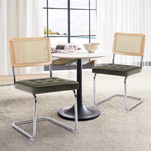 - שילוב חומרים: שילוב מושלם בין מסגרת מתכת כרום מבריק לבין מושב מרופד קטיפה רכה ומשענת גב דמוי ראטן בגוון טבעי, יוצר מראה וינטג' מודרני אלגנטי.