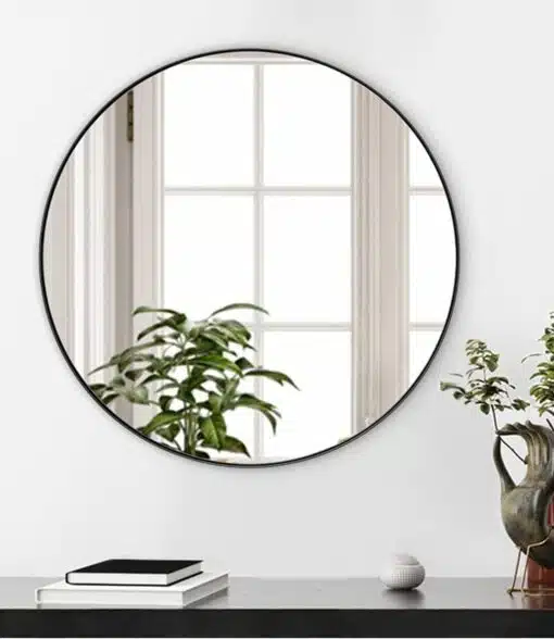 מראה עגולה לאמבטיה עם מסגרת מתכת דקה בצבע שחור .