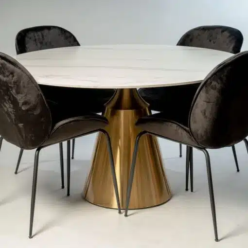 שולחן פינת אוכל עגול מקרמיקה פלטת השולחן בגוון לבן עם גידים , בסיס השולחן עשוי ממתכת אל חלד חזקה ויציבה בגוון שחור בצביעה אלקטרוסטטית איכותית. השולחן מעוצב היטב וישתלב לצד עיצובים וסגנונות שונים.