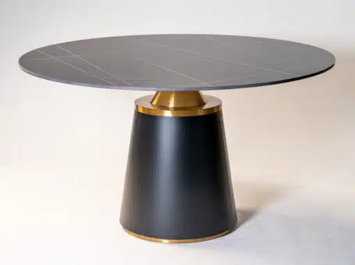 שולחן פינת אוכל עגול מקרמיקה בצבע שחור , הפלטה עשיה מגרניט פורצלן יוקרתי , בסיס השולחן עשוי מתכת אל חלד בצביעה אלקטרוסטטית מיוחדת ועמידה במיוחד . השולחן ישתלב עם מגוון סגנונות ועיצובים שונים , קל לתחזוקה עמיד ביותר ושומר על מראה חדיש לאורך שנים.