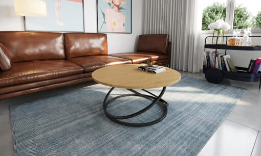 שולחן סלון עגול בגוון עץ אלון , מסגרת השולחן עשויה מתכת אל חלד בצבע שחור , פלטת השולחן עשויה מעץ מתועש עם חיפוי מלמין יצוק.