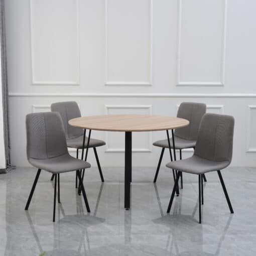שולחן אוכל עגול בעיצוב מינימליסטי המשלב משטח עץ איכותי עם רגלי מתכת דקות בצבע שחור. העיצוב הנקי והאלגנטי, יחד עם המבנה היציב והחומרים האיכותיים, הופכים את השולחן לבחירה מושלמת לכל פינת אוכל מודרנית.