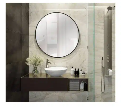 מראה עגולה קוטר ס"מ עם מסגרת שחורה דקה עשויה ממתכת אל חלד מותאם לחדר האמבטיה .