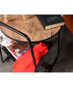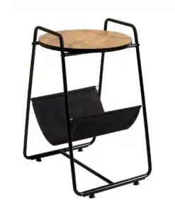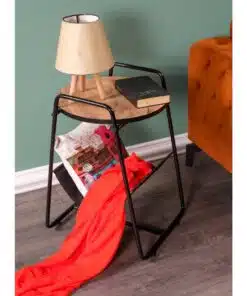 שולחן צד עגול לסלון עשוי ממתכת אל חלד בצבע שחור ואם די אף איכותי עם חיפוי מלמין בגוון עץ אגוז , המדף התחתון עשוי מבד איכותי וחזק בצבע שחור.