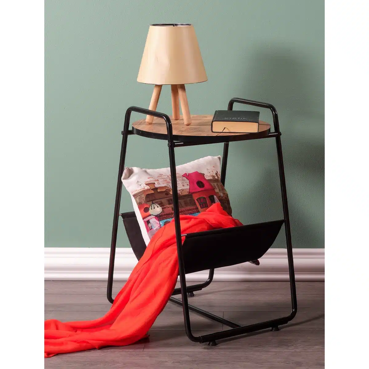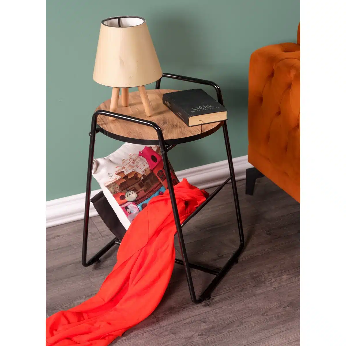 שולחן צד עגול לסלון עשוי ממתכת אל חלד בצבע שחור ואם די אף איכותי עם חיפוי מלמין בגוון עץ אגוז , המדף התחתון עשוי מבד איכותי וחזק בצבע שחור.