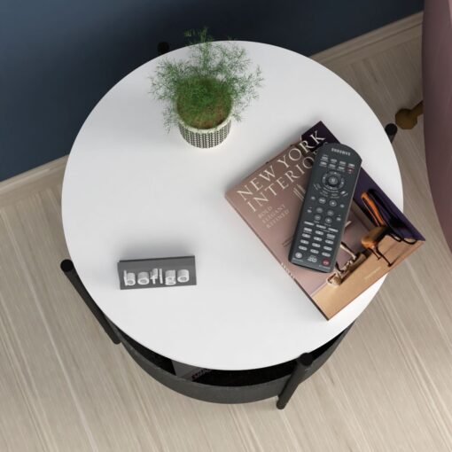 שולחן צד עגול עם סל אחסון מבד בצבע אפור . פלטת השולחן עשויה מ-אם די עם חיפוי מלמין יצוק בצבע לבן מסגרת השולחן עשויה ממתכת אל חלד בצבע שחור.