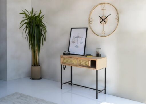 קונסולה כפרית לכניסה לבית עם שני תאי אחסון עם דלתות הזזה, רגלי הקונסלה עשויה מתכת אל חלד בצבע שחור , מסגרת הקונסלה עשויה מעץ מתועש בגוון טבעי משולב עם דמוי ראטן המעניק לפריט עיצוב כפרי.