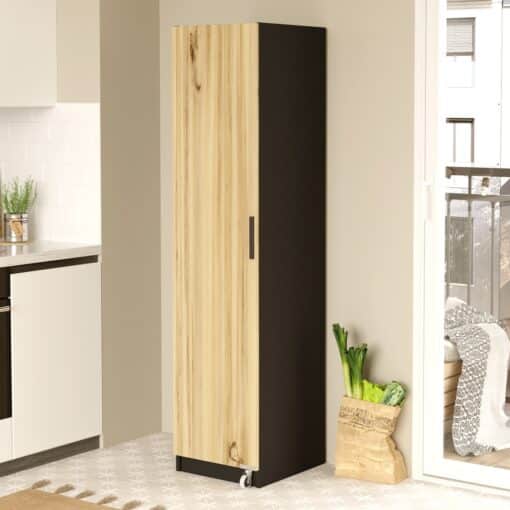 ארון שירות למטבח עם 4 מדפים ועוד 5 מדפים בתוך הארון על גבי הדלת. דלת הארון נתמכת על ידי גלגל לפתיחה. הארון עשוי מעץ מתועש עם חיפוי מלמין יצוק בצבע שחור משולב עם גוון עץ אורן.