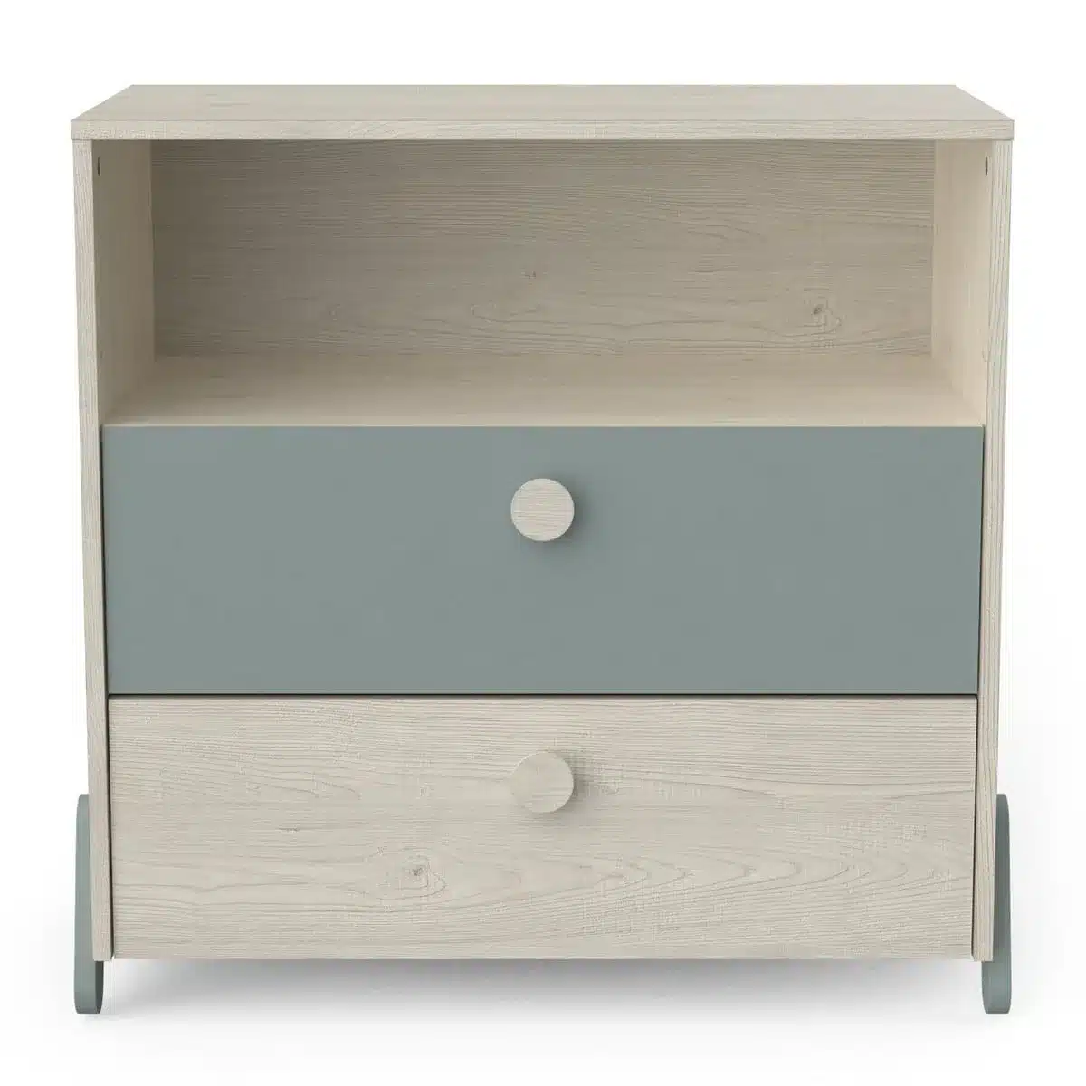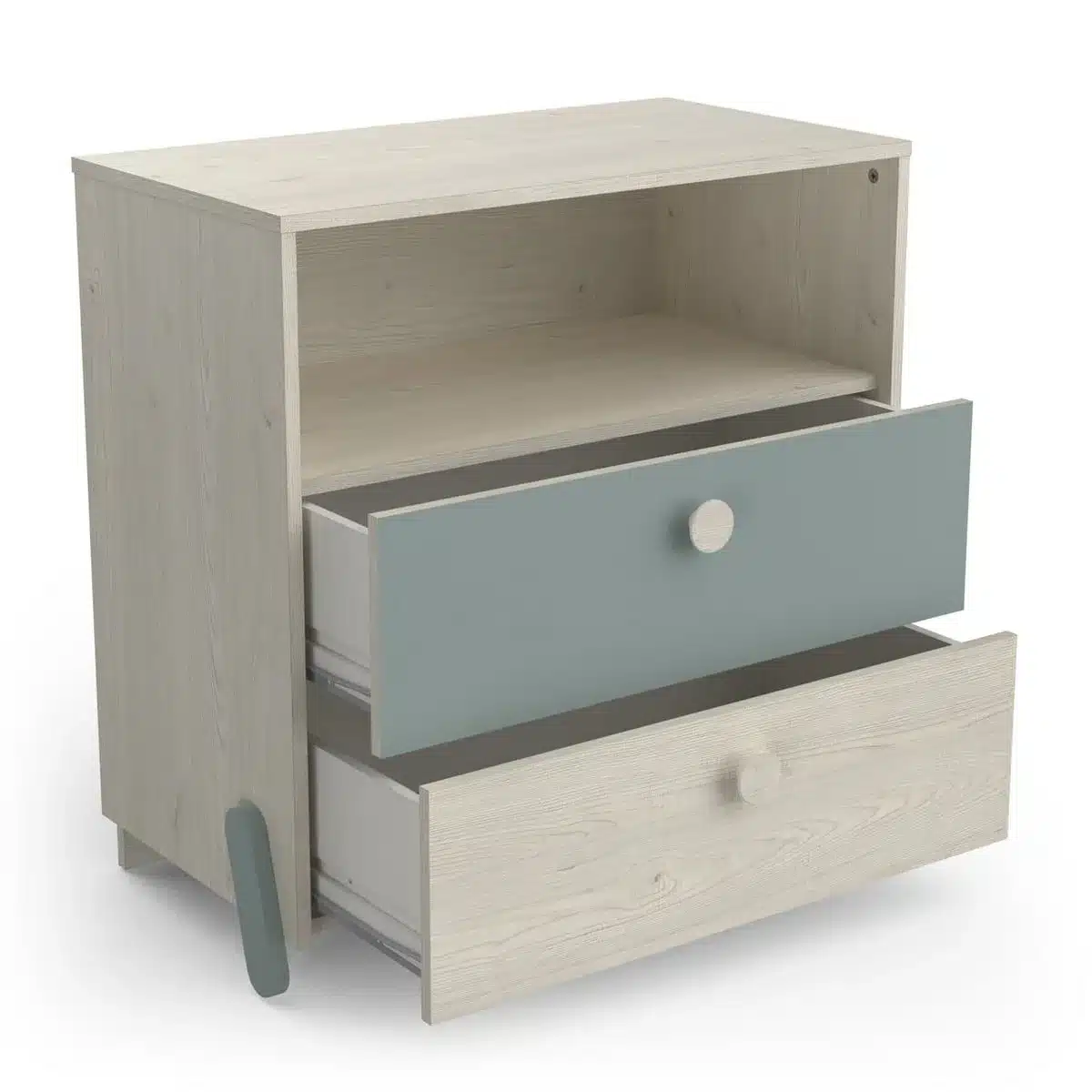 2 מגירות רחבות: מגירות בגודל 65×33.7 ס"מ בגוונים שונים (ירוק-אפור + אלון) עם ידיות עץ עגולות. כל מגירה יכולה לשאת עד 6 ק"ג.