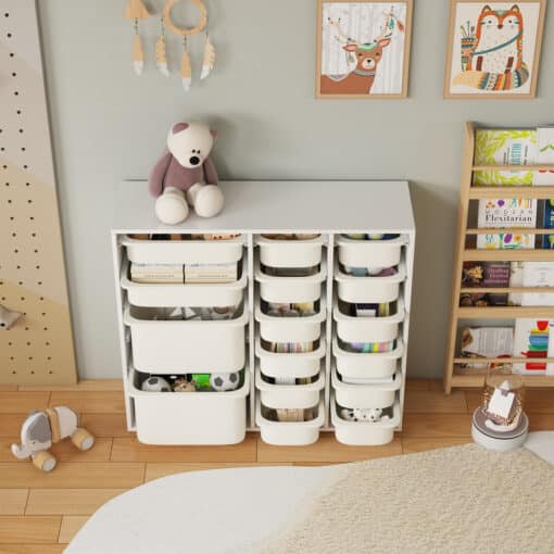 שידת אחסון לחדר ילדים עם מכלים זמינה בגוון לבן נקי המתאים לכל סגנון עיצוב: