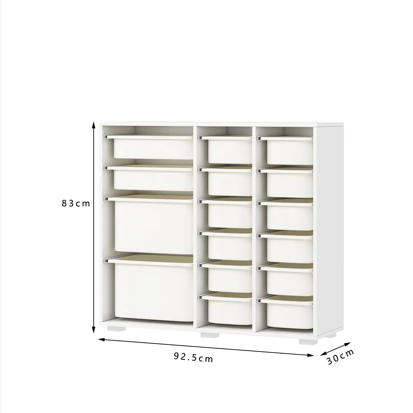 מידות השידה: גובה 83 ס"מ, רוחב 92.5 ס"מ, עומק 30 ס"מ. העומק הנמוך של 30 ס"מ בלבד הופך אותה לאידיאלית גם לחללים צרים, מסדרונות וחדרים קטנים מבלי לתפוס שטח יקר. 16 המכלים על המסילות מאפשרים ניהול ואחסון חכם לבגדים, צעצועים, ספרים, אביזרי משרד ועוד.