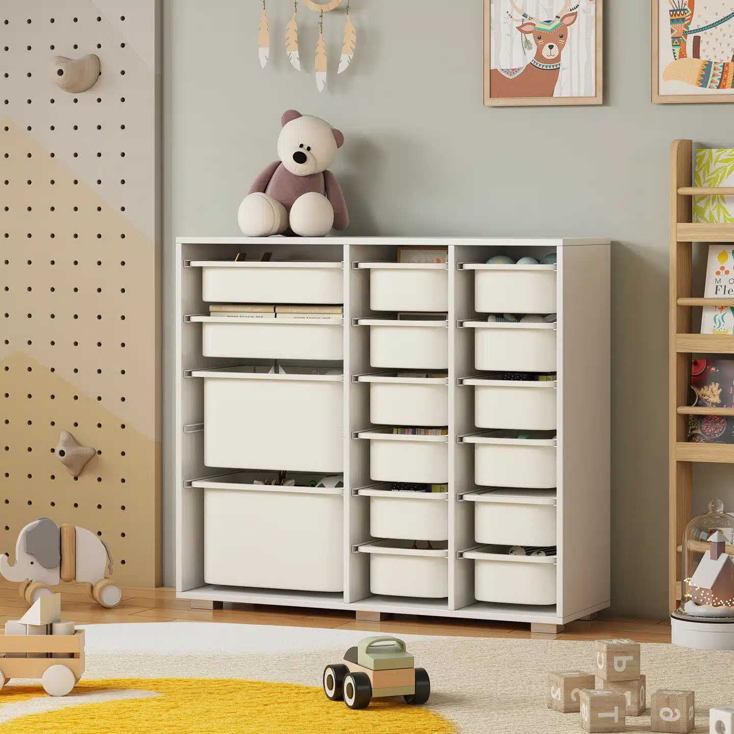 תקציר מוצר – שידת אחסון לחדר ילדים עם מכלים