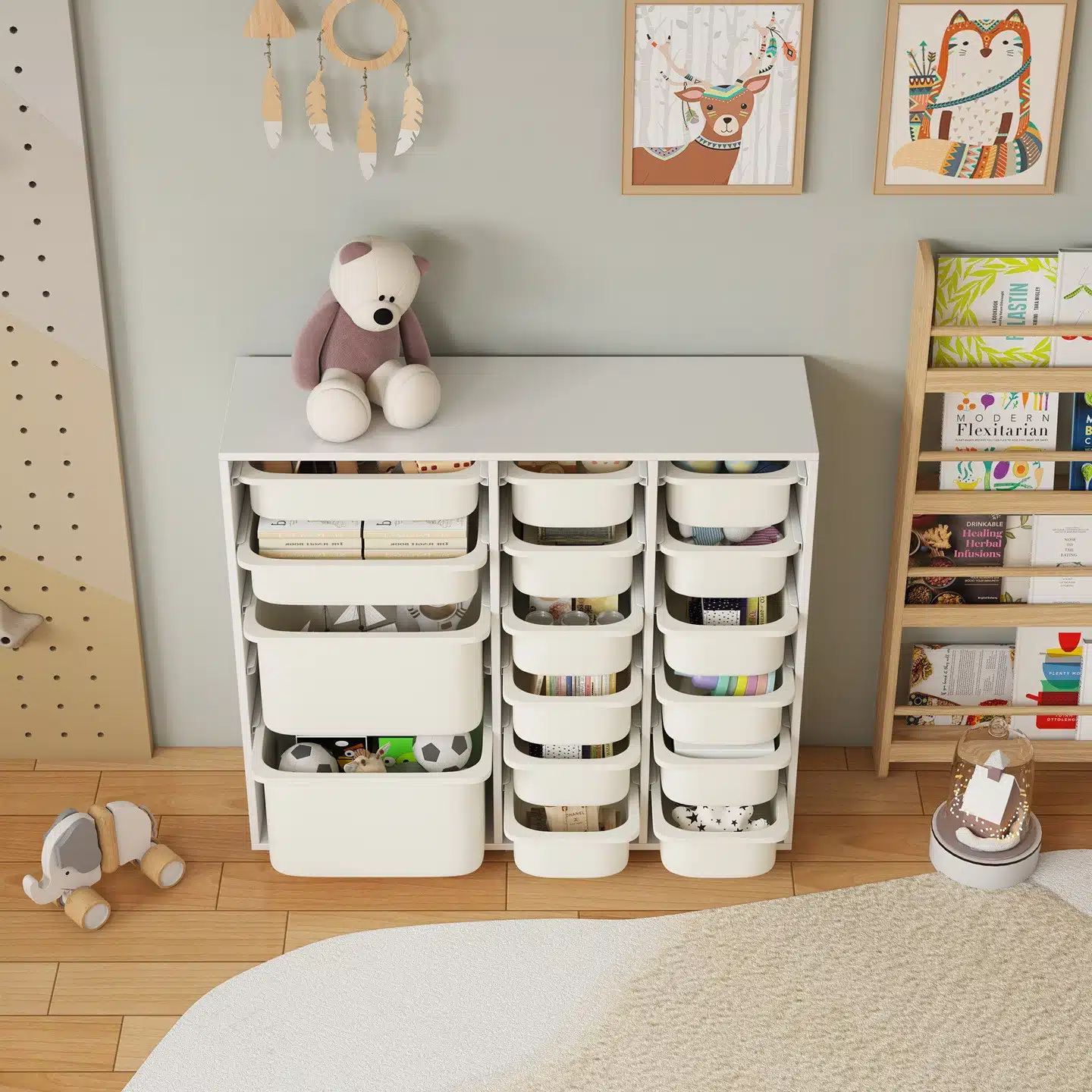שידת האחסון עם המכלים היא הפתרון המושלם לכל מי שמחפש שילוב של סדר, פונקציונליות ועיצוב נקי. מתאימה לחדרי ילדים, חדרי משחק, מסדרונות, חדרי עבודה וכל פינה בבית הדורשת אחסון מסודר ויעיל, ומספקת פתרון אחסון נוח ומרובה לכל בית.