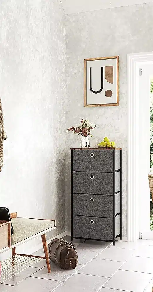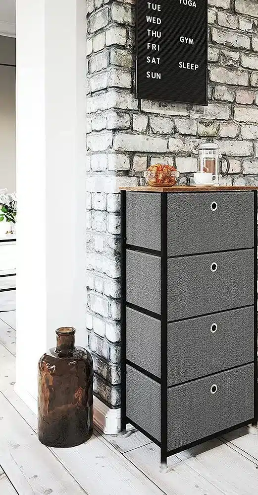 מגירות מרווחות: 4 מגירות בד בצבע אפור כהה עם ידיות מתכת מעוצבות לפתיחה נוחה.