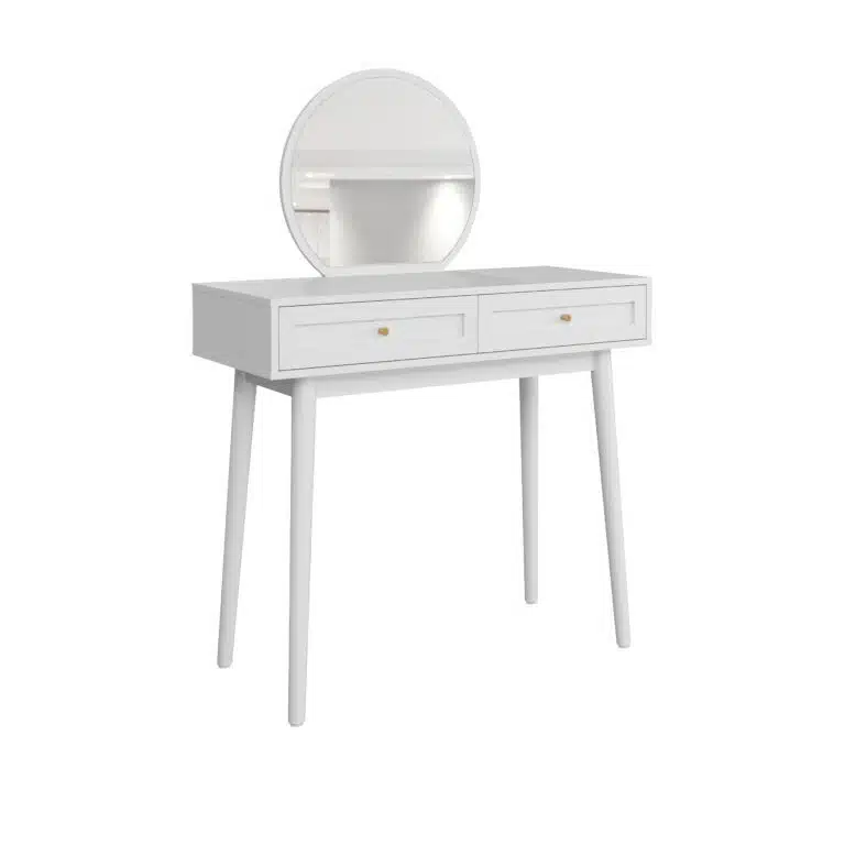 שידת איפור עם מראה עגולה בעיצוב סקנדינבי נקי ומרשים, המשלבת אלגנטיות ופונקציונליות במידות קומפקטיות. מושלמת לחדרי שינה, פינות איפור ודירות בגדלים שונים.