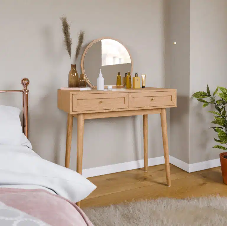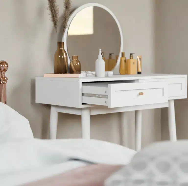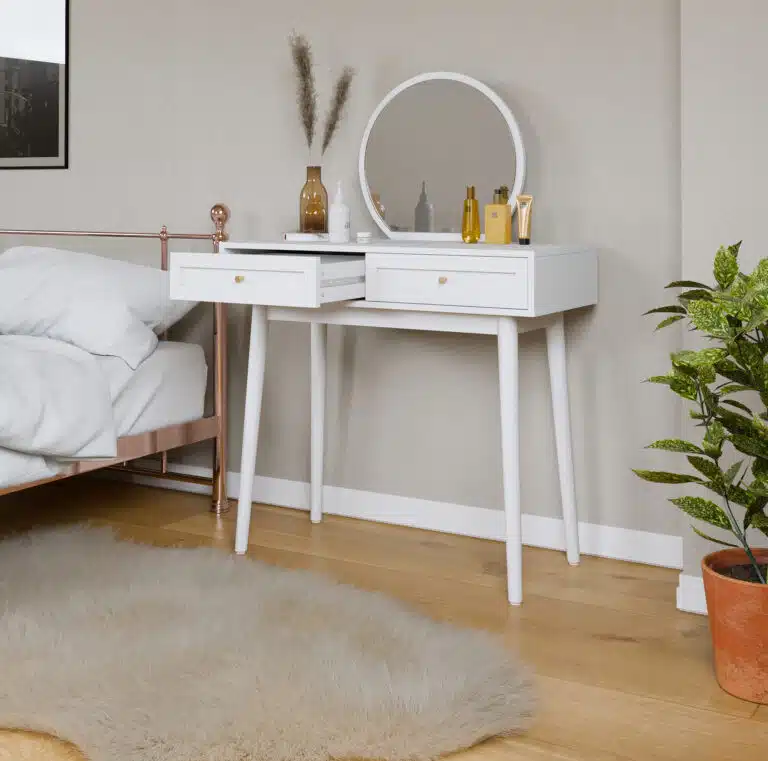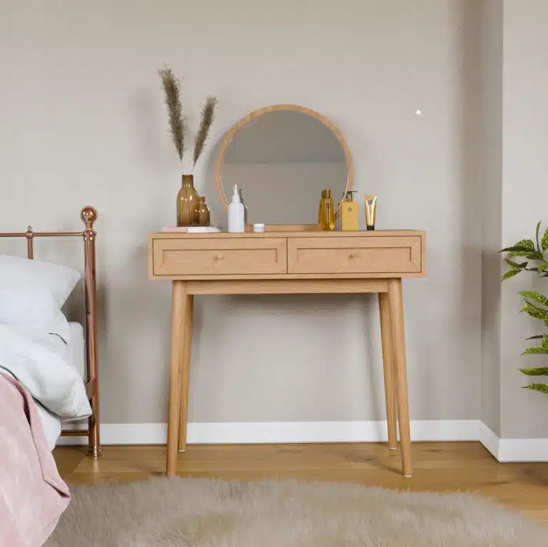 שידת איפור עם מראה עגולה בסגנון סקנדינבי – פינת היופי המושלמת לחדר השינה