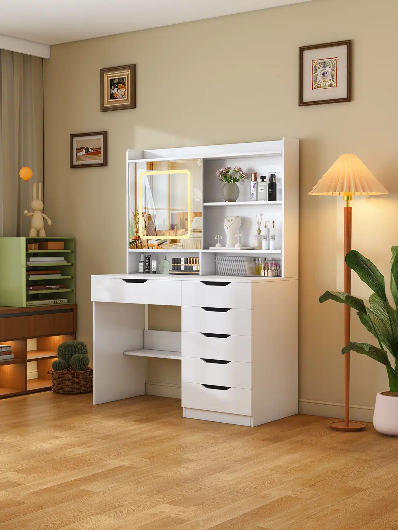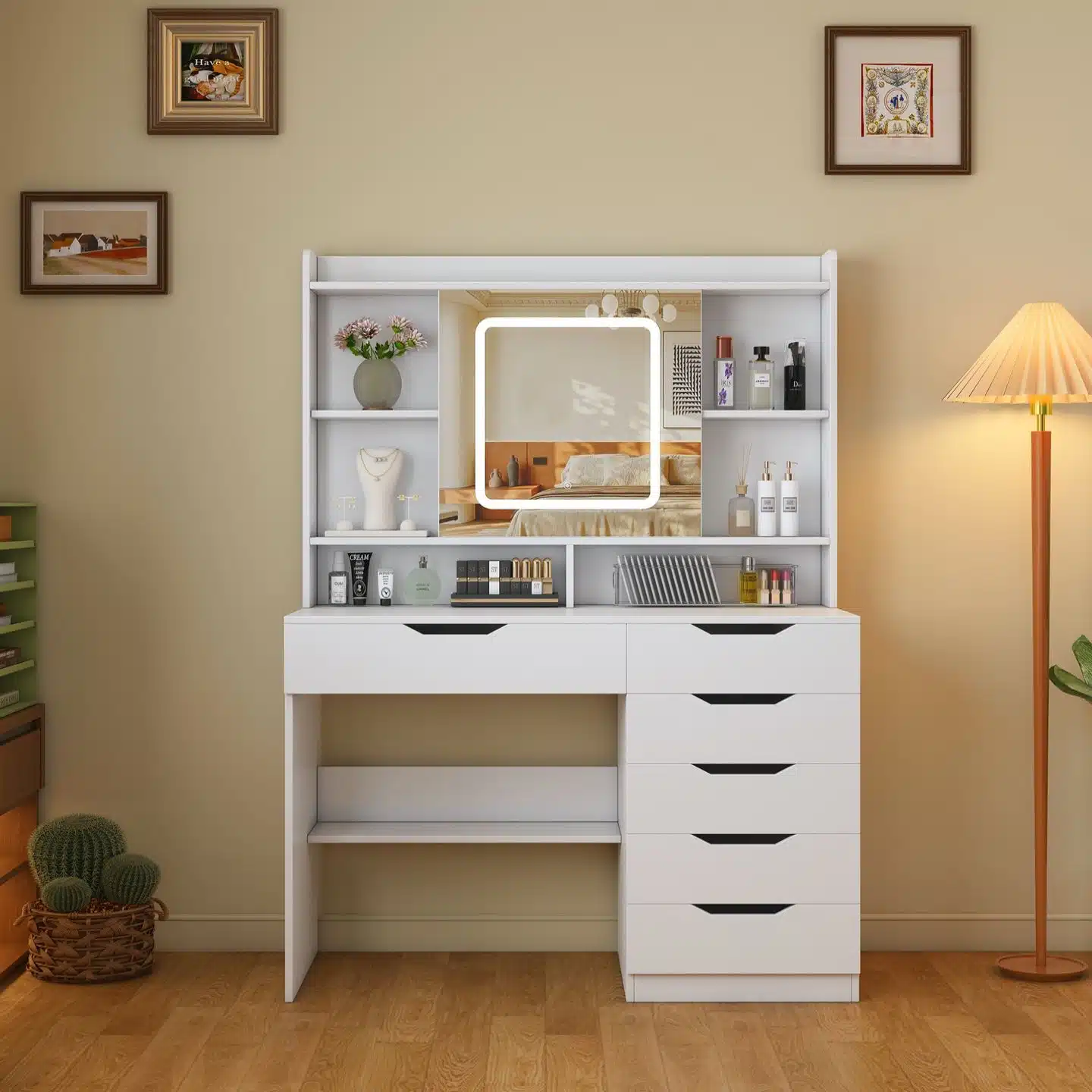 אחסון חכם: מגירות רבות ומדפים פתוחים לסידור כלי האיפור, בשמים ואביזרים בצורה מסודרת ונגישה.