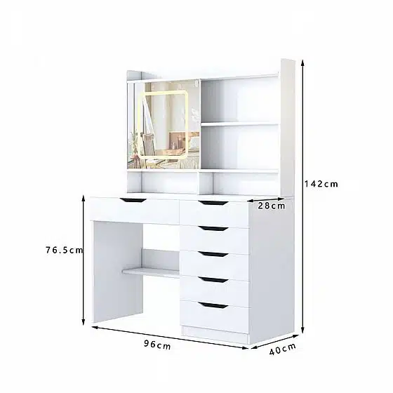 מידות שידת האיפור עם תאורת לד ומראה מחושבות בקפידה למיקסום שטח האחסון תוך חיסכון בשטח הרצפה: רוחב 96 ס"מ, עומק 40 ס"מ וגובה כללי 142 ס"מ. גובה שולחן העבודה עומד על 76.5 ס"מ לישיבה נוחה, ועומק המדפים העליונים 28 ס"מ. מגירות רבות ומדפים פתוחים מאפשרות סידור נוח ונגיש של כל כלי האיפור, בשמים וטיפוח.