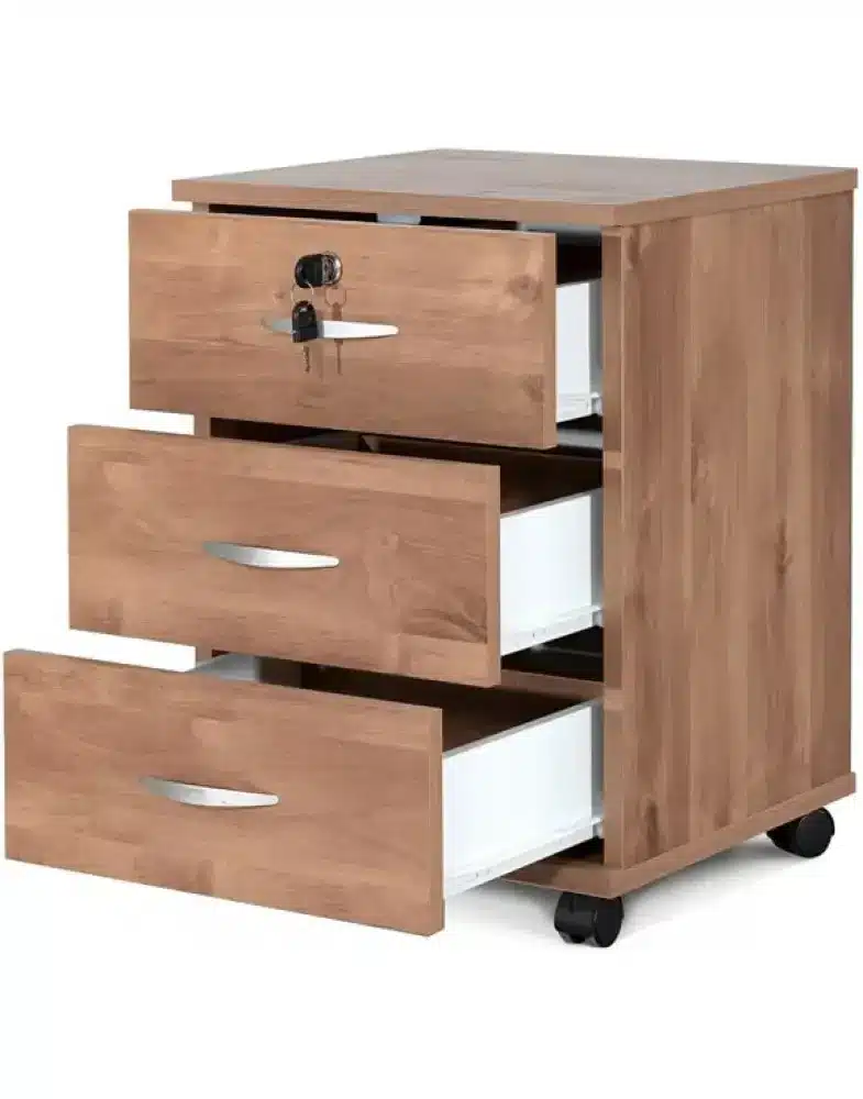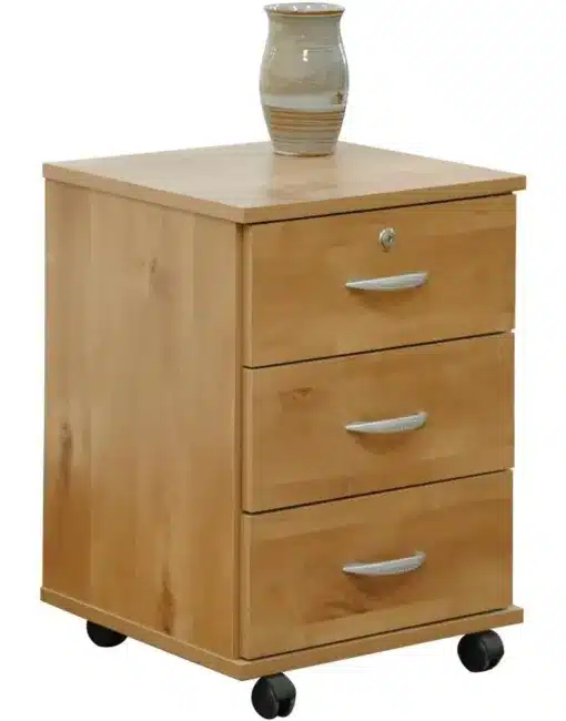 שידת לילה 3 מגירות על גלגלים זמינה בגוון עץ טבעי המתאים לכל סגנון עיצוב מודרני: