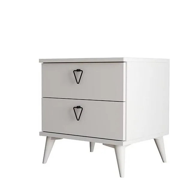 העיצוב המודרני והנקי של שידת הלילה משלב השפעות סקנדינביות עם נגיעות רטרו. הרגליים המשופעות בזווית אלגנטית מעניקות לשידה מראה קליל ואוורירי, בעוד הידיות המשולשות בצבע שחור יוצרות ניגודיות מעניינת עם גוף השידה הלבן. השידה עשויה שבבית דחוסה בעובי 18 מ"מ עם ציפוי מלמין יצוק באיכות גבוהה, המעניק לה יציבות ועמידות לאורך זמן.