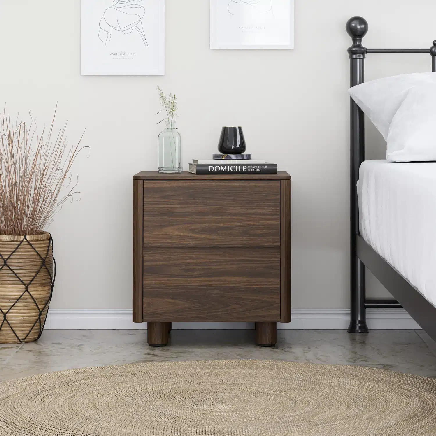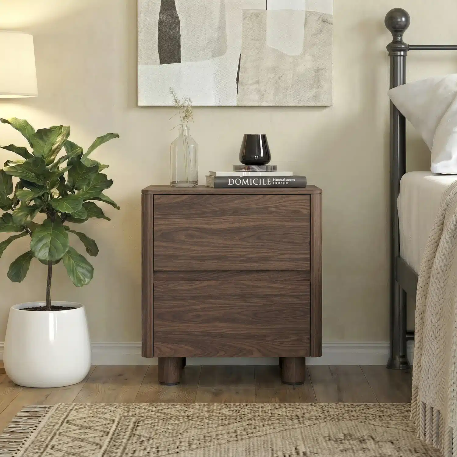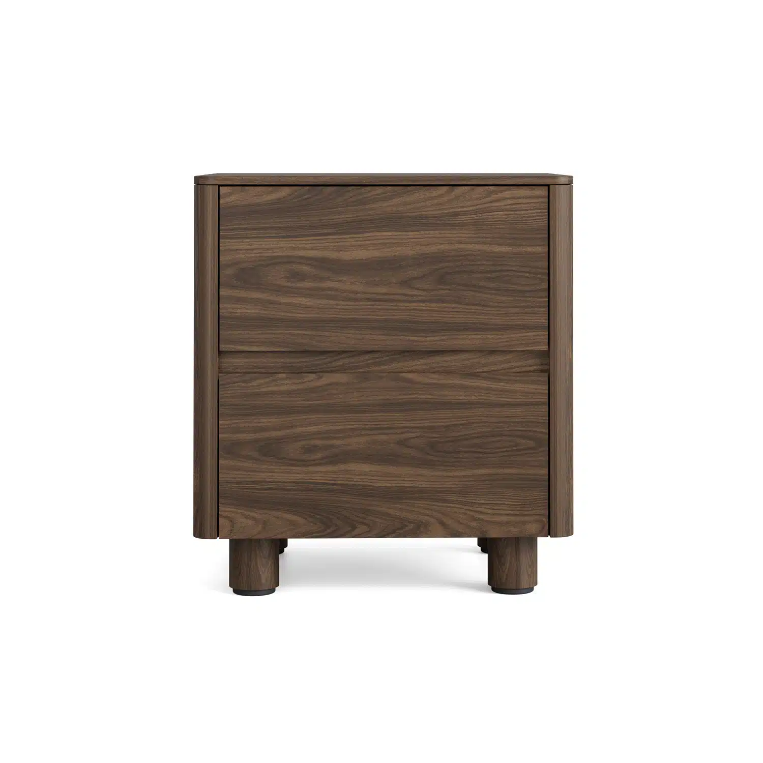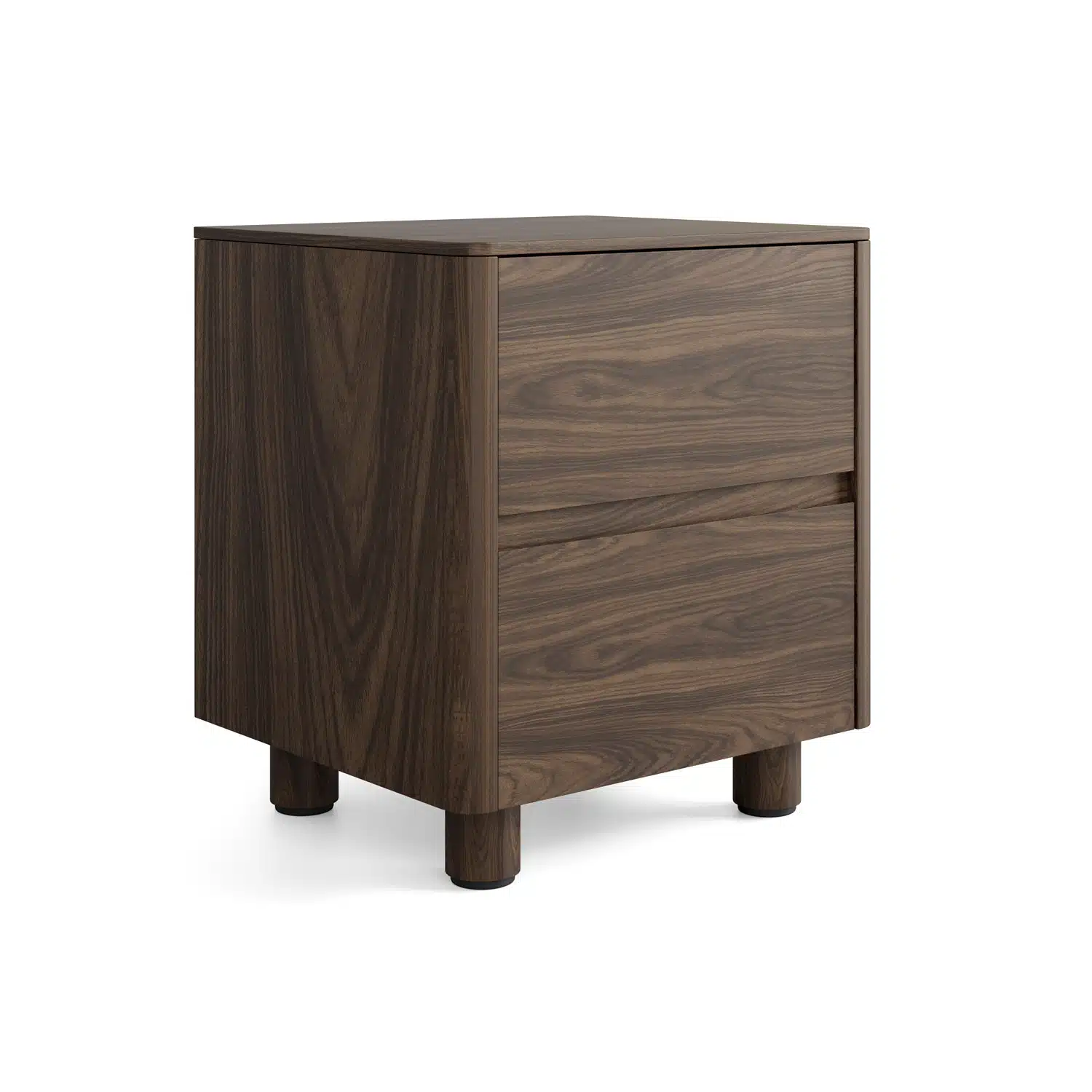 שידת לילה אלגנטית בסגנון סקנדינבי עכשווי, המשלבת קווים נקיים עם פינות מעוגלות וחזית חלקה ללא ידיות. רגלי עץ גליליות מעניקות מראה קליל ואוורירי.