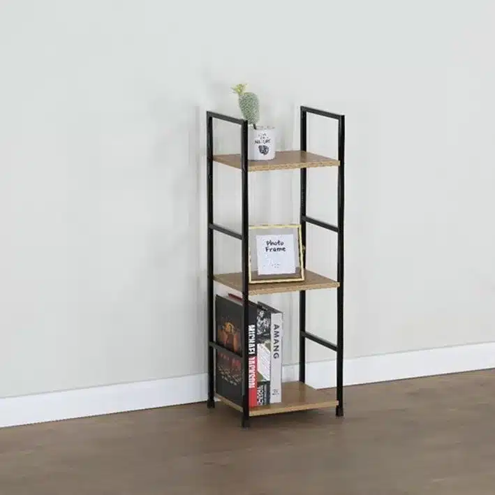 כוננית מדפים תעשייתית בעיצוב מודרני ומינימליסטי עם 3 מדפים מעשיים. השילוב האלגנטי של מתכת מושחרת ומדפי עץ בגוון אלון טבעי יוצר מראה אורבני ועכשווי שמתאים לכל חלל בבית.