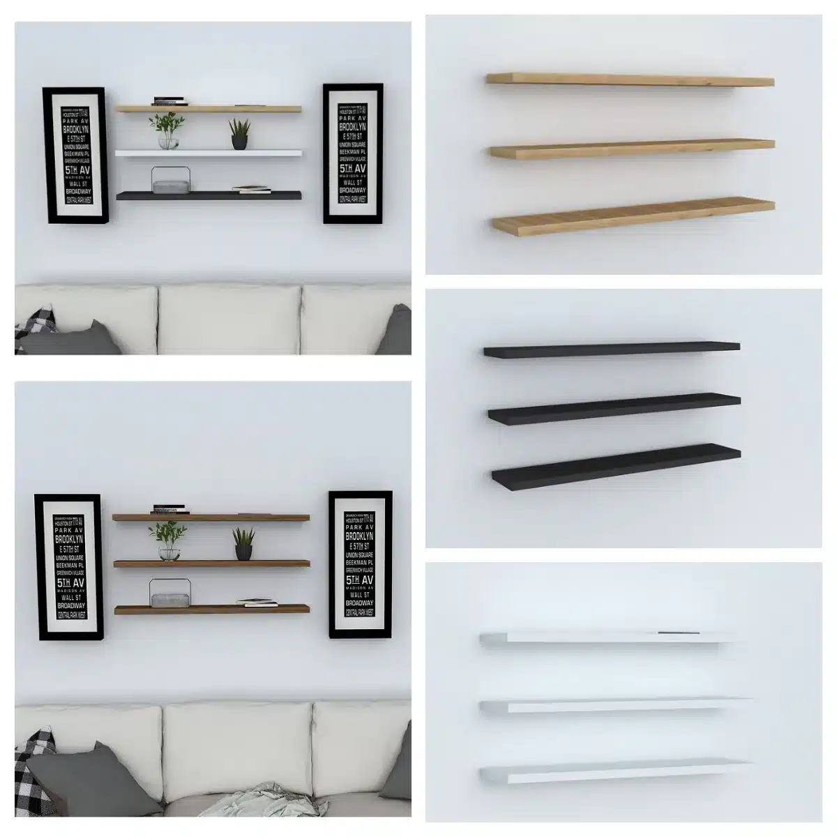 שלישיית המדפים הצפים זמינה ב-5 גוונים מעוצבים המתאימים לכל סגנון עיצוב מודרני: