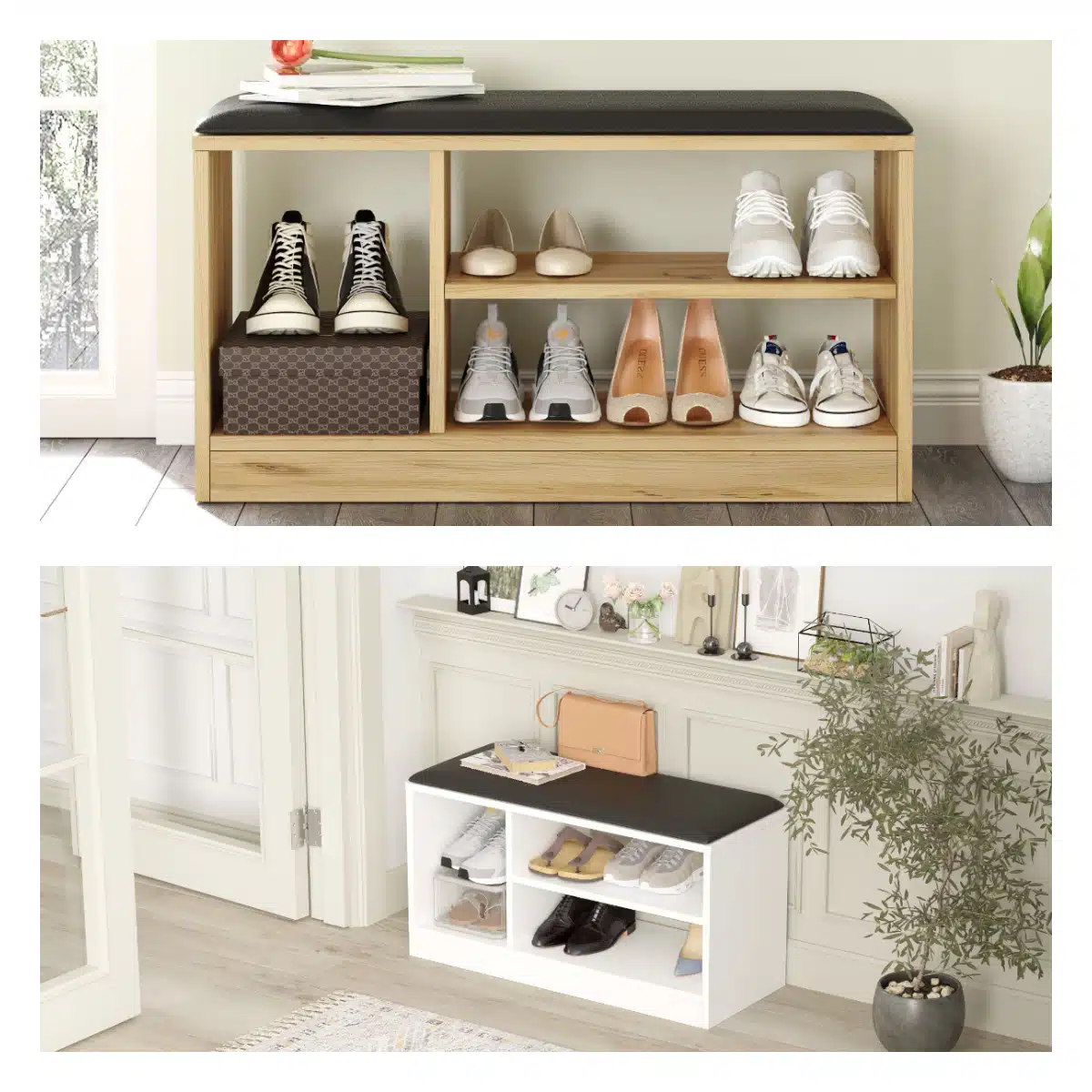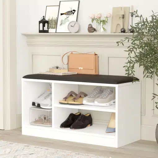 שידת נעליים עם ספסל מרופד לחדר השינה או לכניסה לבית. עשויה מעץ מתועש עם חיפוי מלמין יצוק. עם 3 מדפי נוחים ונגישים לאחסון נעליים או לכל דבר שתחפצו. המושב מרופד בדמוי איכותי וקל לניקוי בצבע שחור.