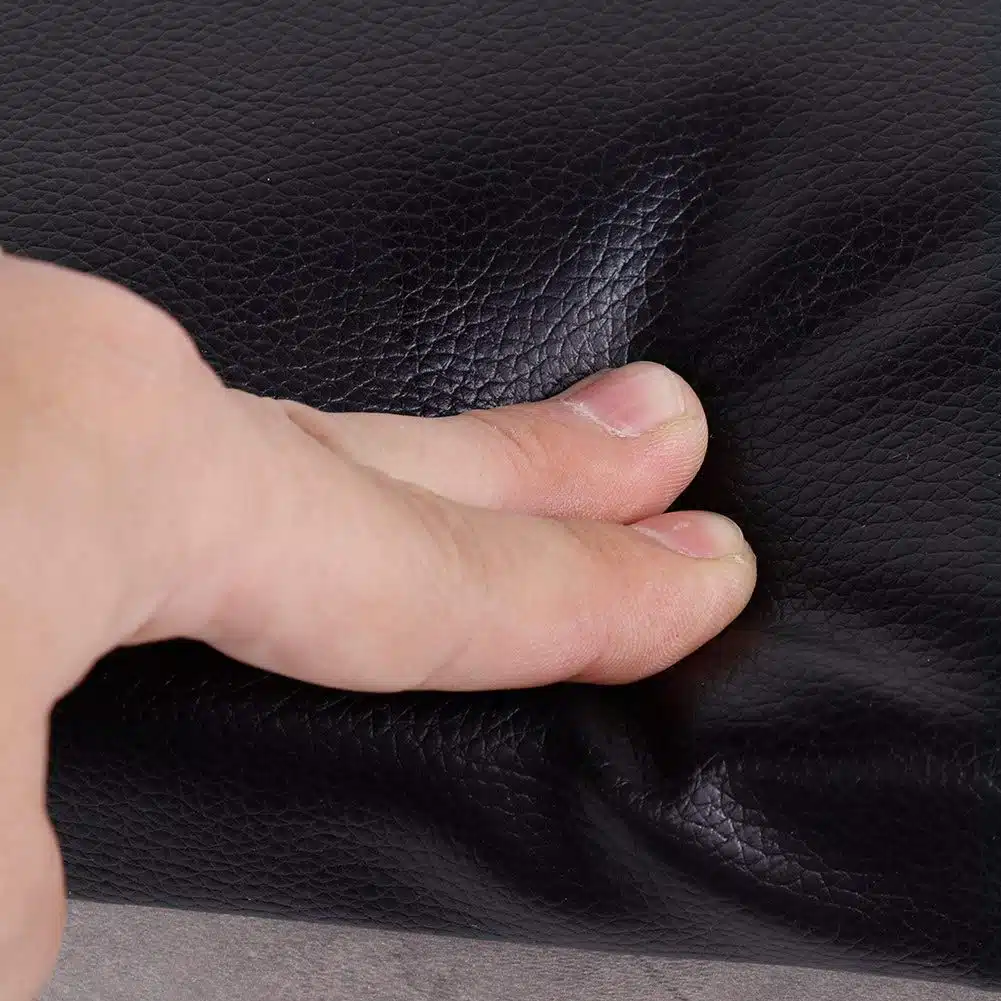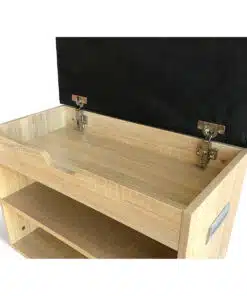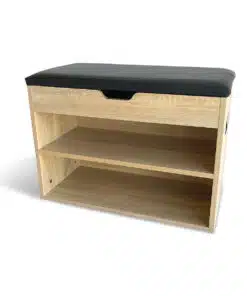 שידה לאחסון נעליים עם מושב מרופד בדמוי עור שחור עם שני מדפים לאחסון נעליים וקלאפה נפתחת מתחת למושב לאחסון חפצים.
