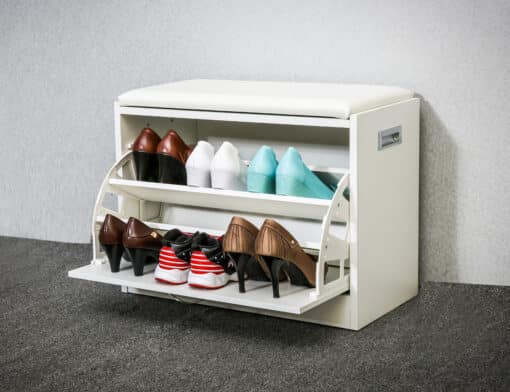שידת נעליים עם מושב לחדר השינה בצבע לבן, תא אחסון גדול לאחסון נעליים בצורה מסודרת ונוחה לשליפה מהירה. השידה עשויה מ-MDF איכותי בחיפוי מלמין בתקן אירופאי בצבע לבן, המושב מרופד בדמוי עור איכותי – PU.