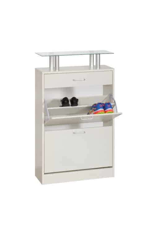 שידת מגירות אחסון לנעליים בצבע לבן עשויה משבבית דחוסה בחיפוי מלמין איכותי בתקן אירופאי בצבע לבן. השידה מכילה שני תאי אחסון לנעליים ומגירה נוספת לאחסון חפצים שונים . מעל המגירות יש מדף זכוכית מחוסמת בעובי 4 מ"מ