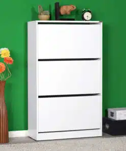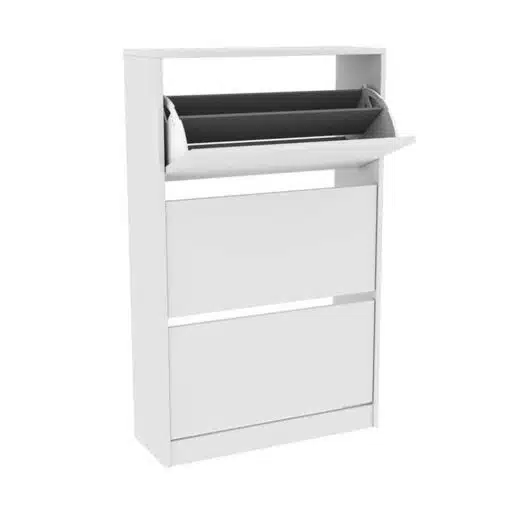 שידת לאחסון נעליים עם 3 תאי אחסון כפולים לאחסון נעליים . השידה עשויה מעץ מתועש עם חיפוי מלמין יצוק בצבע לבן. מתאימה לשימוש בכניסה לבית או לחדר השינה.