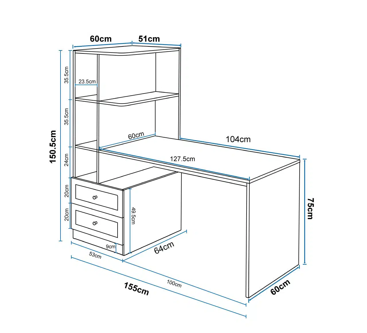 מידות: רוחב 155 ס"מ | עומק 64 ס"מ | גובה 150.5 ס"מ | גובה משטח עבודה 75 ס"מ