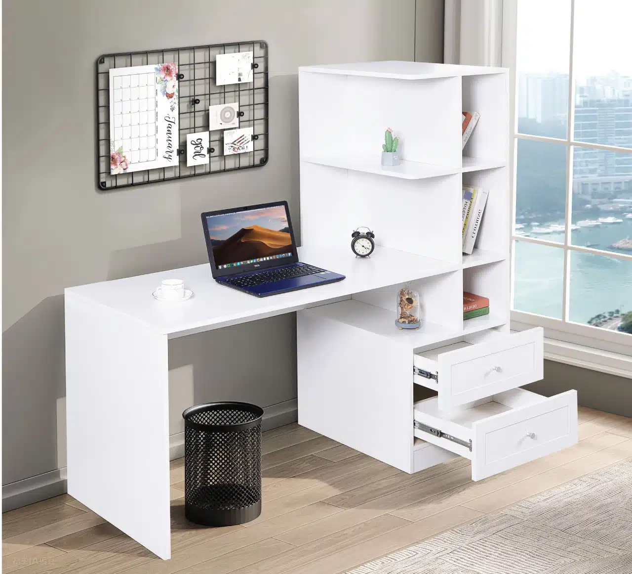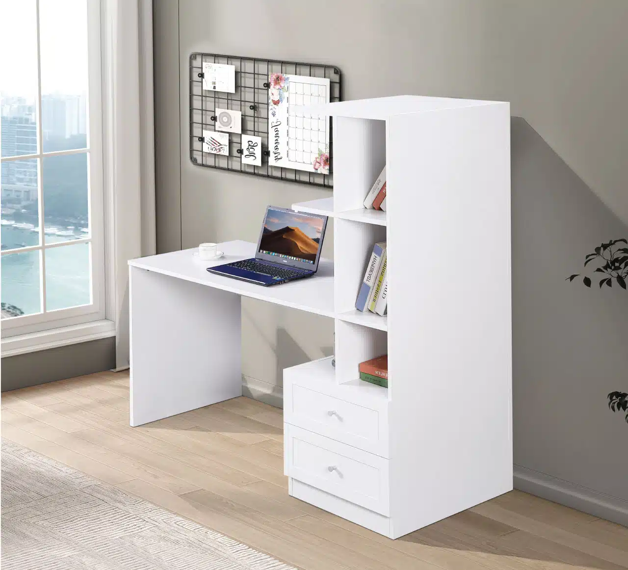 שולחן עבודה עם כוורת בעיצוב מודרני ונקי, המשלב משטח עבודה רחב עם ספרייה פונקציונלית. מושלם לתלמידים, סטודנטים ועובדים מהבית.