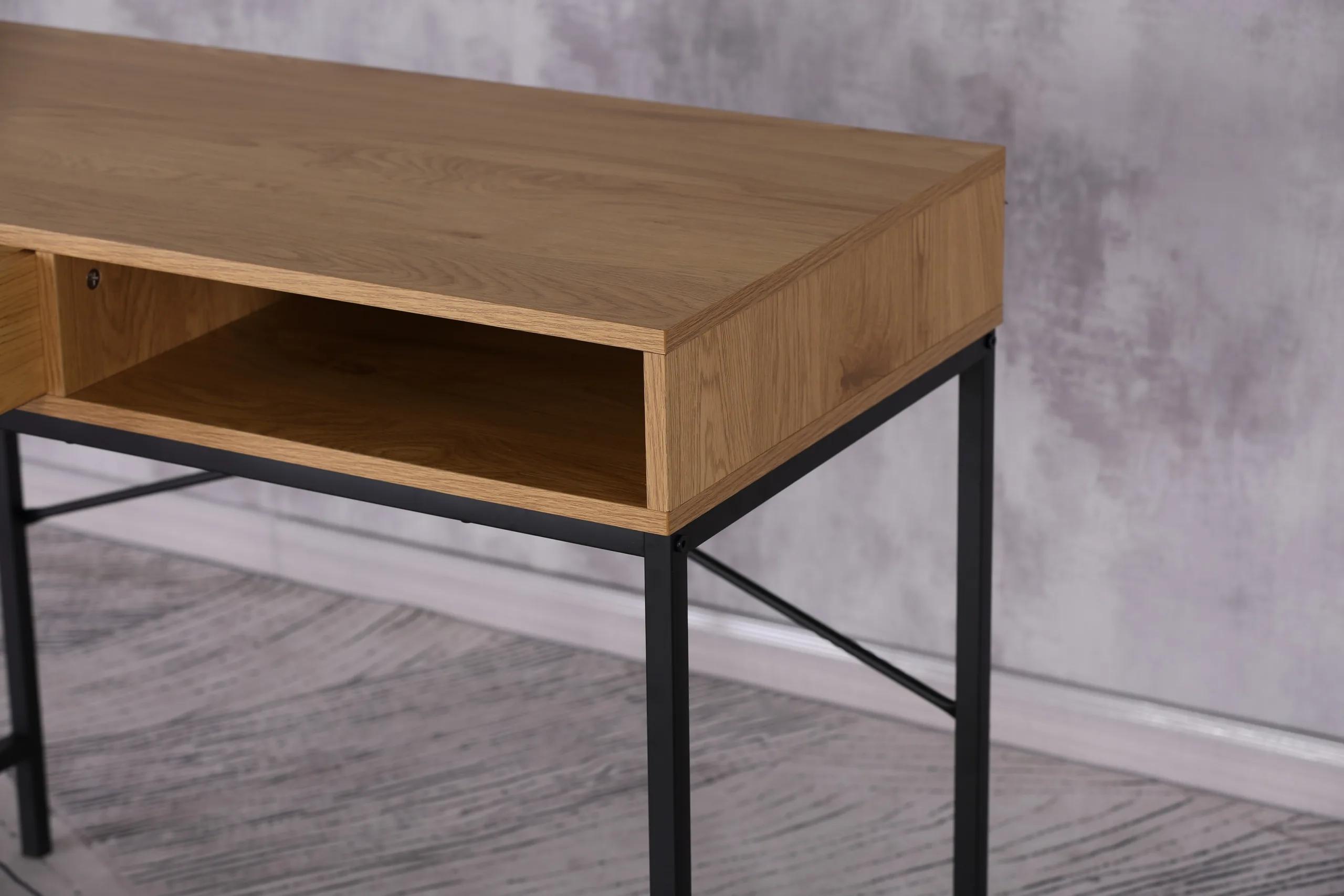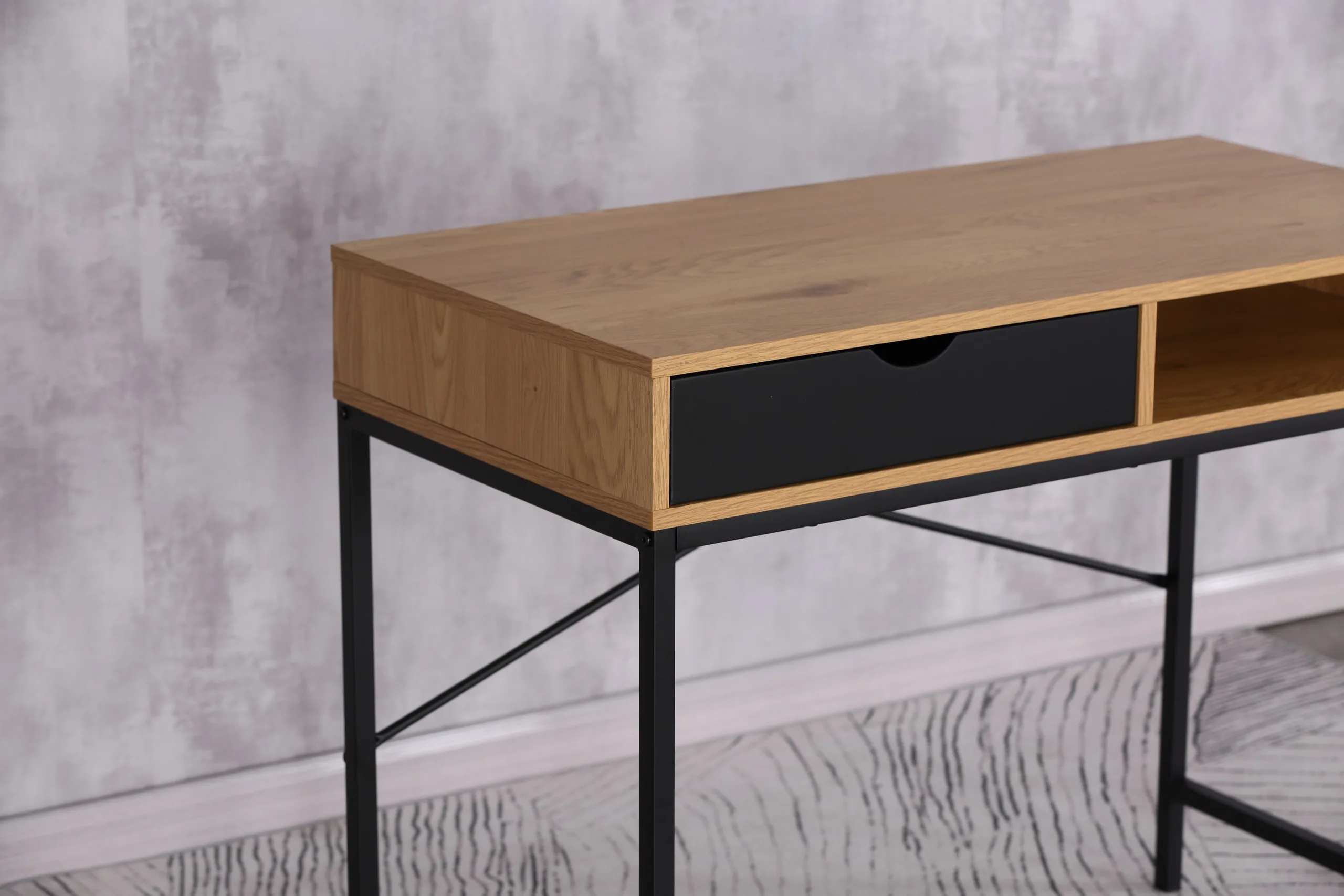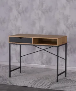 העיצוב המודרני והנקי של שולחן העבודה המעוצב מבוסס על מבנה איכותי עשוי MDF בציפוי PVC איכותי בגוון אלון חם ונעים, בשילוב מסגרת מתכת איכותית בצבע שחור. השילוב של גוון העץ הטבעי עם המתכת השחורה יוצר מראה תעשייתי-מודרני שמשתלב בכל סגנון עיצוב. המבנה החזק והיציב מבטיח עמידות גבוהה תחת עומס של ציוד משרדי, מחשב נייד, מסכים ומסמכים. השילוב של אלגנטיות קלאסית ופונקציונליות מעשית הופך את השולחן לרהיט עבודה מעוצב שמעניק פתרון עבודה חכם ונוח.